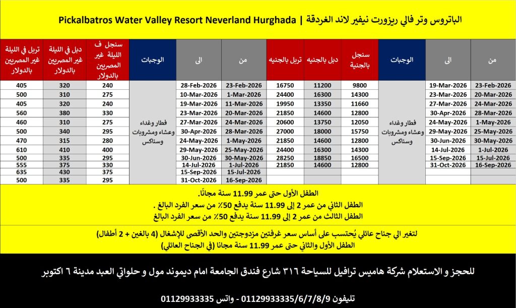 فرد+طفلين الطفل الأول من سنتين الى 11.99 سنة مجانًا الطفل الثاني من سنتين الى 11.99 سنة يدفع 50% من سعر الفرد فى الغرفة الدابل