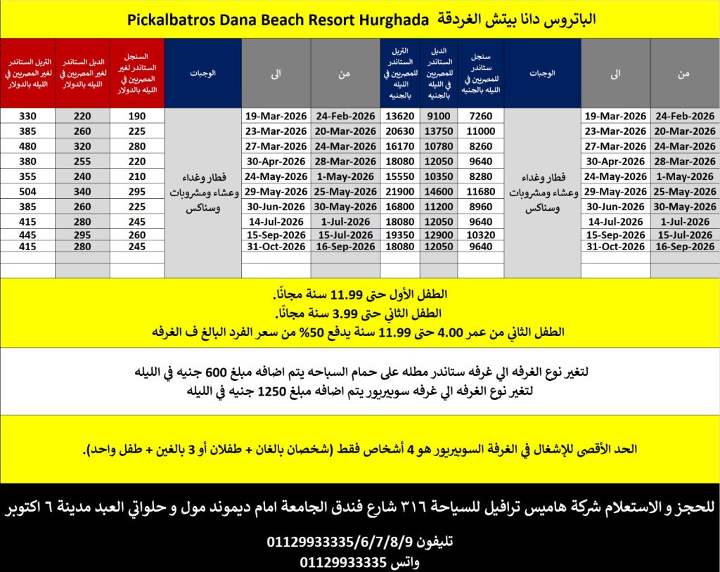 الطفل من 0 الى 5.99 سنه مجانا / الطفل من 6 الى 11.99 سنه 50% من سعر الفرد في الغرفه الدابل / الطفل من سن 12 سنه يحاسب كفرد بالغ