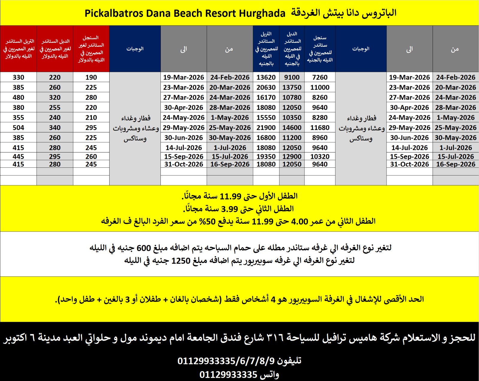 الطفل الاول حتى 11.99 سنه مجانا / الطفل الثاني حتى 5.99 سنه مجانا / الطفل التاني من 6 حتى 11.99 50% من سعر الفرد في الغرفة الدبل