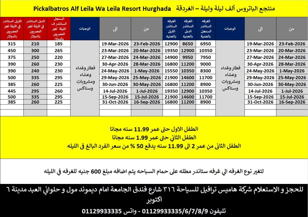 جميع الأسعار المذكورة شاملة إقامة طفل واحد مجانًا حتى سن 11.99 سنة · أي طفل إضافي يتم دفع تكلفة إضافية قدرها 500 جنيه للطفل الواحد او 12.5 دولار أمريكي. (الحد الأقصى طفلان في الغرفة)