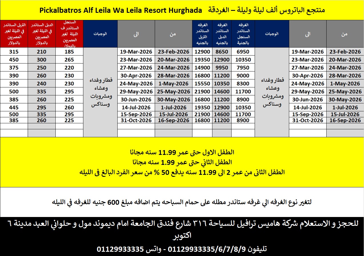 الطفل من 0 الى 5.99 سنه مجانا / الطفل من 6 الى 11.99 سنه 50% من سعر الفرد في الغرفه الدابل / الطفل من سن 12 سنه يحاسب كفرد بالغ