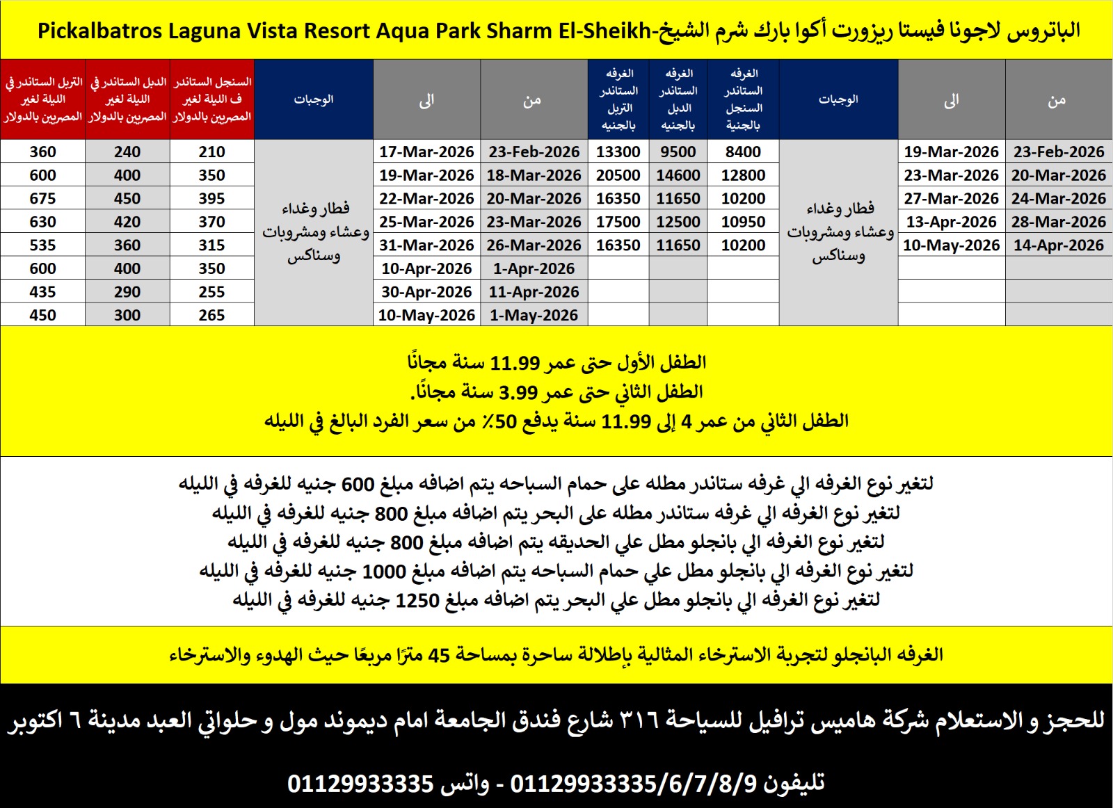 الطفل الأول من 0 – 11 سنة مجانا / الطفل الثاني من 0 سنة حتى 5.99 سنة مجاناً / الطفل الثاني من 6 حتى 11.99 سنة 50% من سعر الفرد في الغرفة الدابل