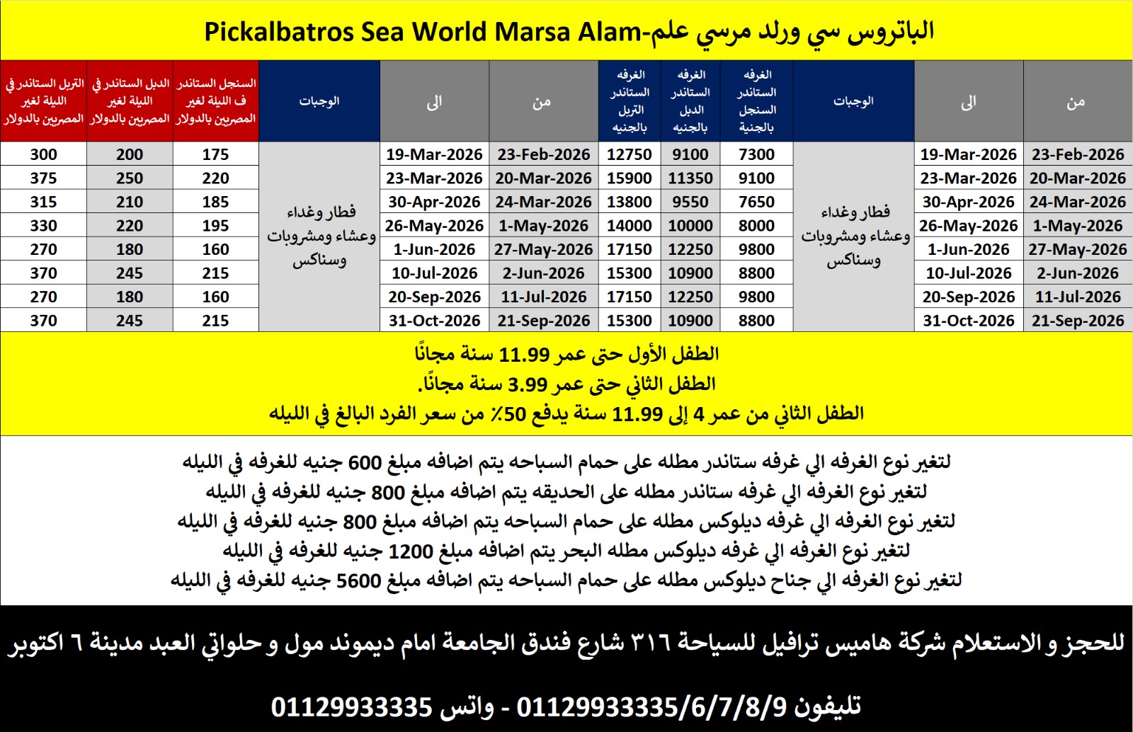 الطفل الاول من 0 الى 11.99 سنة مجاناً يشارك غرفة الوالدين / الطفل الثانى من 0 الى 4.99 سنة مجاناً يشارك غرفة الوالدين