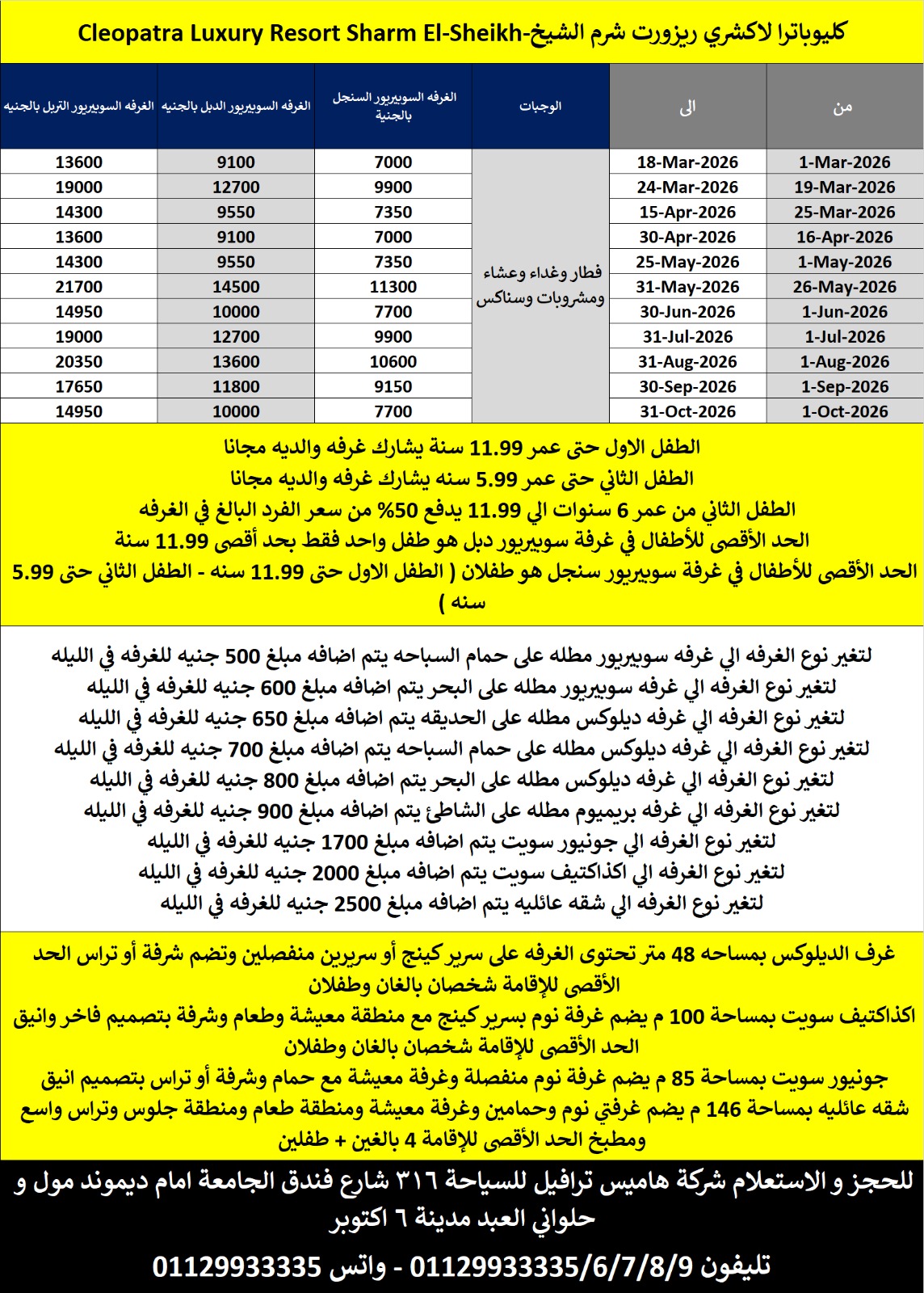 الرضيع من 0 الى 2.99 سنة مجاناً يشارك غرفة الوالدين الطفل الأول من 0 الى 11.99 سنة مجاناً يشارك غرفة الوالدين الطفل الثانى من 3 سنين الى 11.99 سنة يدفع 50% من سعر الفرد فى الغرفة الدابل ويشارك غرفة الوالدين