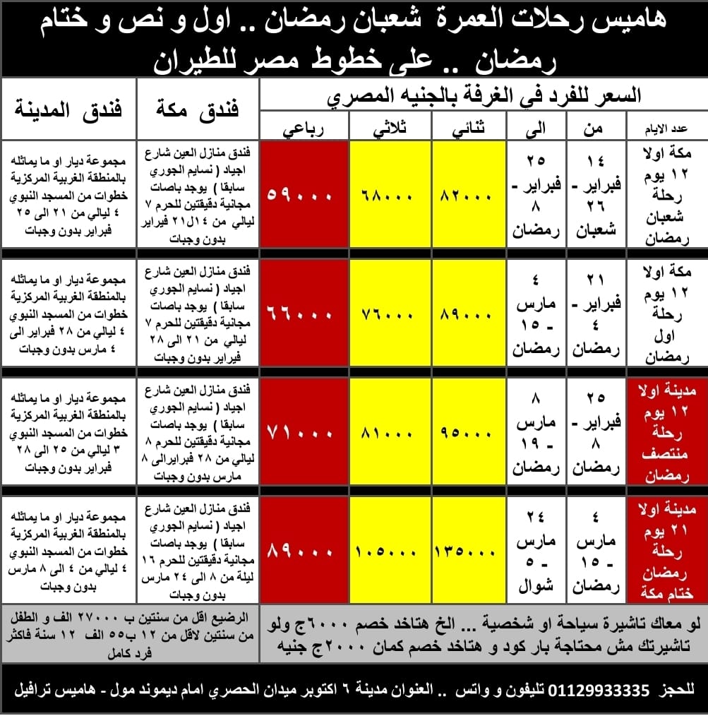 السعر💰 شامل لكافة البرامج تاشيرة العمرة✅️ والباركود✅️ الصادر من بوابة العمرة المصرية المعتمد و الاقامة بالفنادق🏨 و تذاكر الطيران✈️ وكافة المزارات و الانتقالات 🚍باتوبيسات سياحية مكيفة بمكة و المدينة و دخول الروضة الشريفة بالمدينة🕌 ومشرف خاص🙋♀️ معتمد من وزارة السياحة المصرية