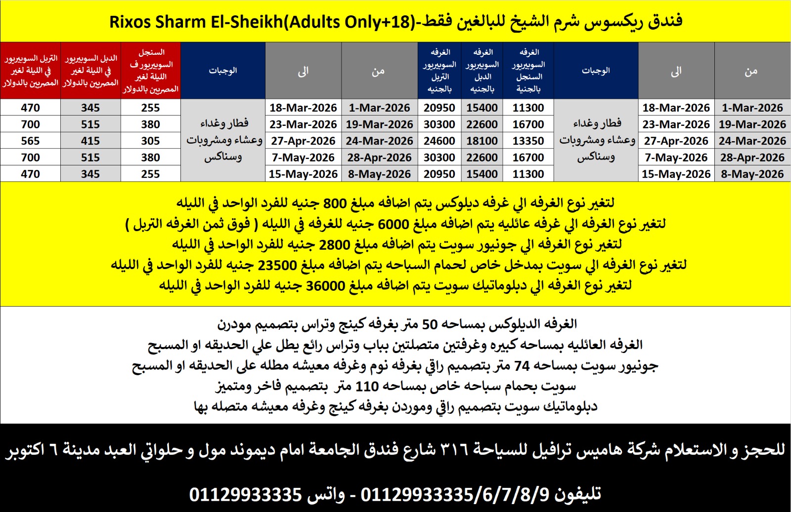 ريكسوس شرم الشيخ هو منتجع فاخر شامل كلياً يقع في خليج نبق حيث تلتقي الصحراء بمياه البحر الأحمر الصافية، ويتميز بإطلالات رائعة على خليج العقبة وجزيرة تيران وحدائق مورقة تمتد حتى الشاطئ الرملي الذهبي. يضم المنتجع غرفاً فاخرة مزينة بأناقة مع شرفات أو تراسات تطل على البحر أو الحديقة أو المسبح، إضافةً إلى مركز مؤتمرات وسبعة مسابح وسبعة مطاعم تقدم قوائم مأكولات وتسعة مطاعم انتقائية وتسعة بارات، إلى جانب شاطئ خاص وخدمة واي فاي مجانية وخدمة خادم شخصي في الكبانات مقابل تكلفة إضافية. يوفر المنتجع مجموعة واسعة من تجارب الطعام، بما في ذلك المأكولات التركية واليابانية والإيطالية والآسيوية والهندية والمأكولات البحرية والبرازيلية، فضلاً عن عروض ترفيهية مسائية وصالة خارجية مثل club X. كما يقدم السبا تجربة استرخاء متكاملة تشمل جلسات المساج وعلاجات الوجه، مع توفر جيم حديث وثلاث منزلقات مائية. ويتيح النادي الرياضي الحصري برامج متنوعة مثل البيلاتس، اليوغا الهوائية، القفز المائي، الدراجات الثابتة، إضافة إلى أنشطة كالتنس والكرة الطائرة الشاطئية والغطس. يقع المنتجع على بعد 8 كم فقط من مطار شرم الشيخ الدولي و22 كم من خليج نعمة، ويوفر خدمة حافلة مجانية للممشى، كما يتيح لجميع الضيوف دخولاً مجانياً إلى منتزه ريكسوس أكوافنتشر المائي في ريكسوس بريميوم سي جيت، ويستقبل العائلات والأزواج لمن هم فوق 18 عاماً فقط.