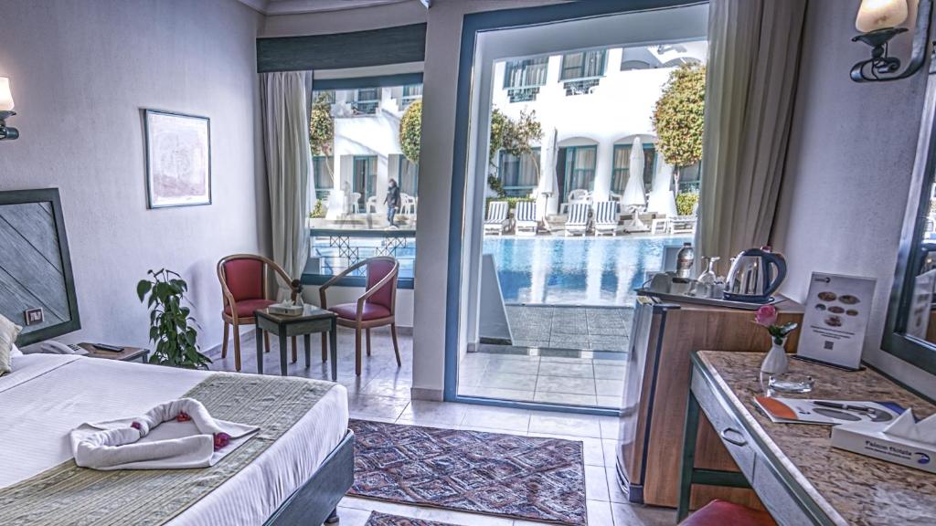 لحجزغرفة مطلة على حمام السباحة يتم اضافه مبلغ 650 جنيه او 15 دولار للفرد الواحد فى الليلة