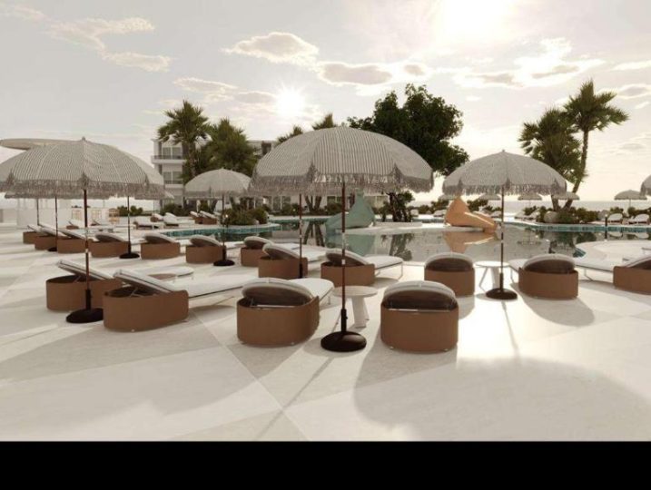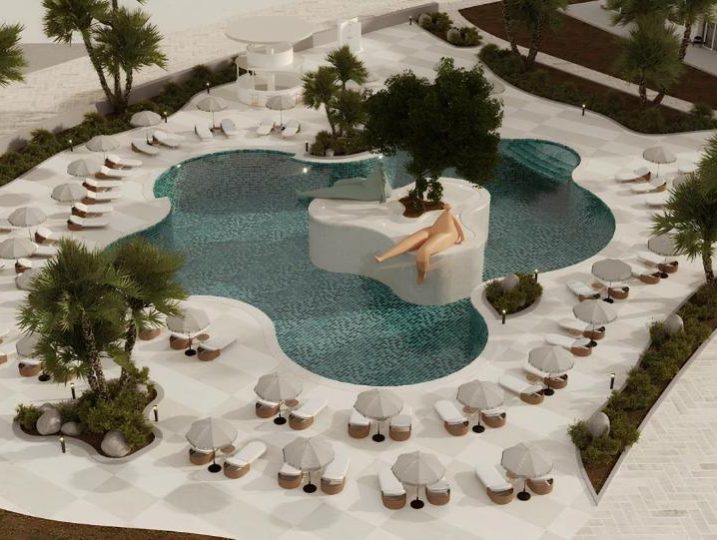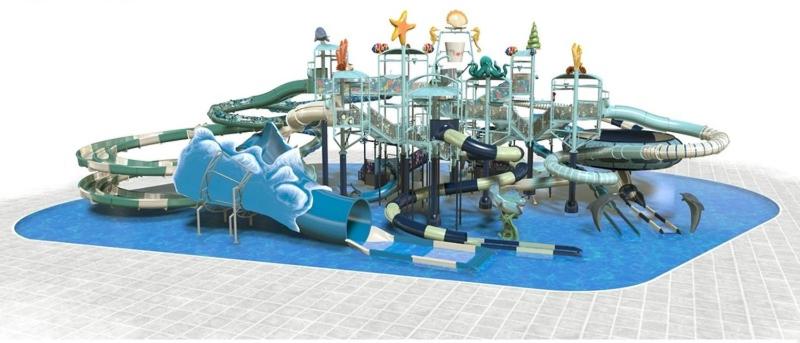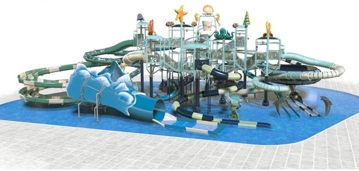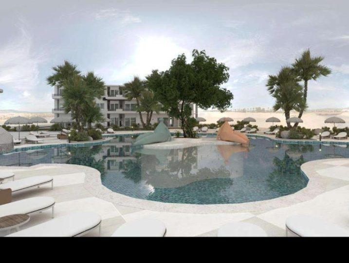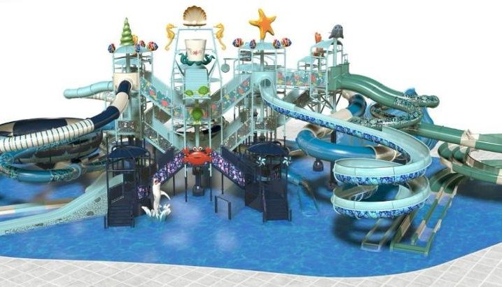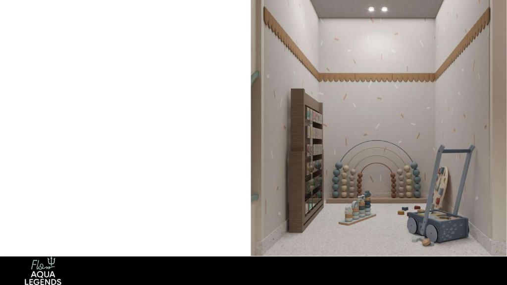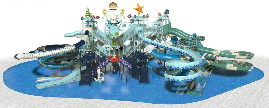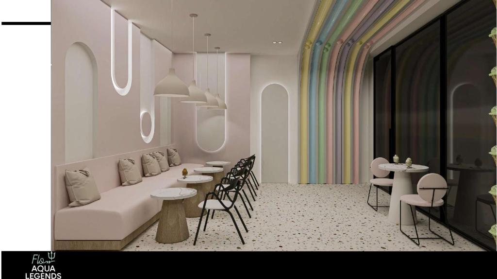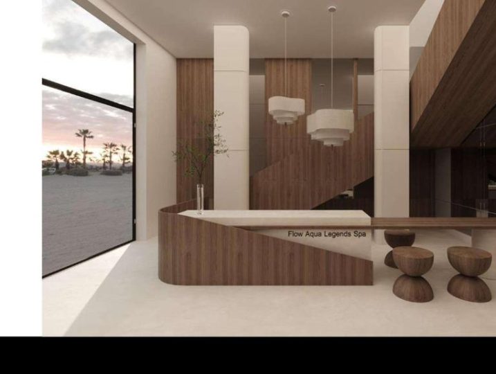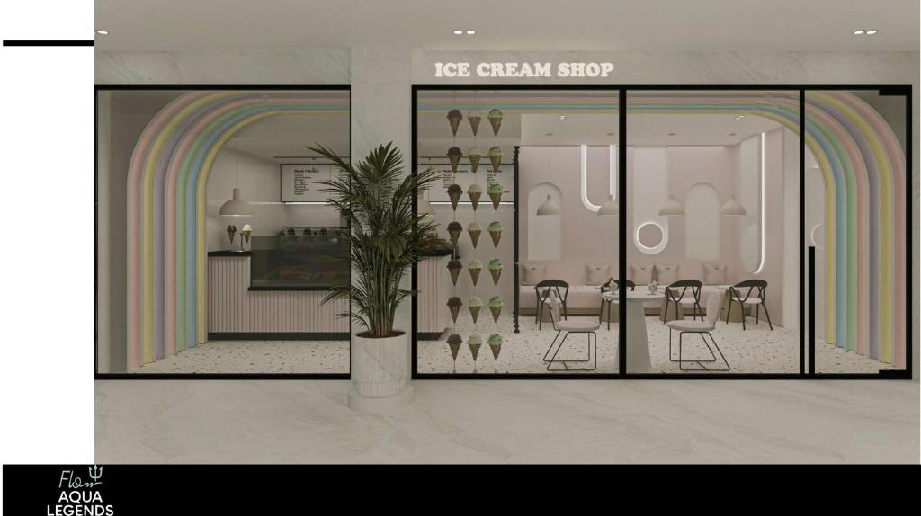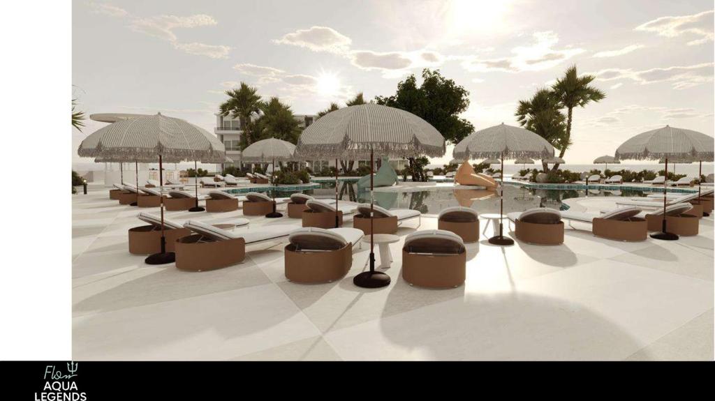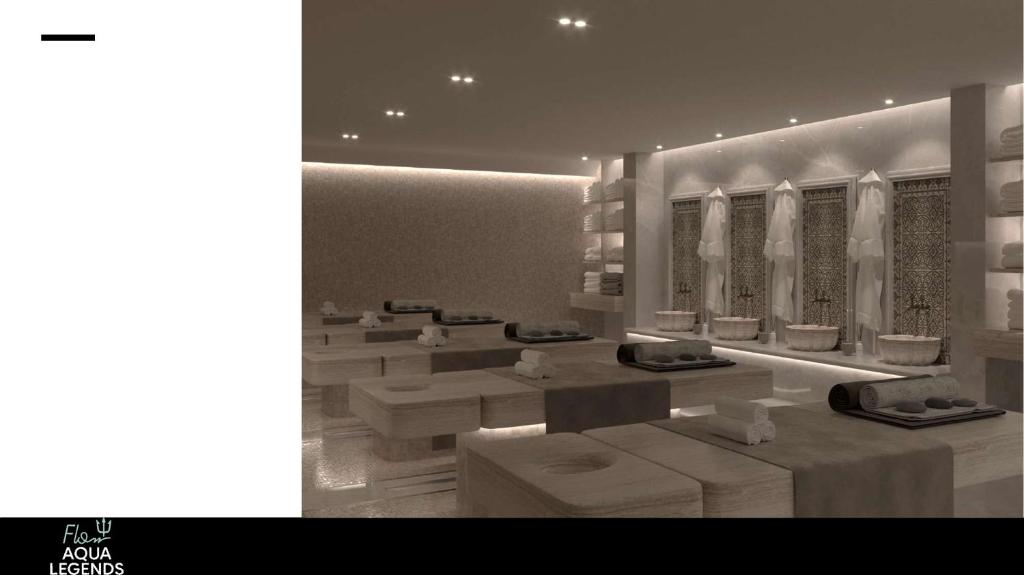 عالم المياه: مسبح خارجي (مفتوح طوال العام)، ملهى مائي (Aqua Park)، ومنطقة شاطئ خاص مع كراسي استرخاء ومظلات.