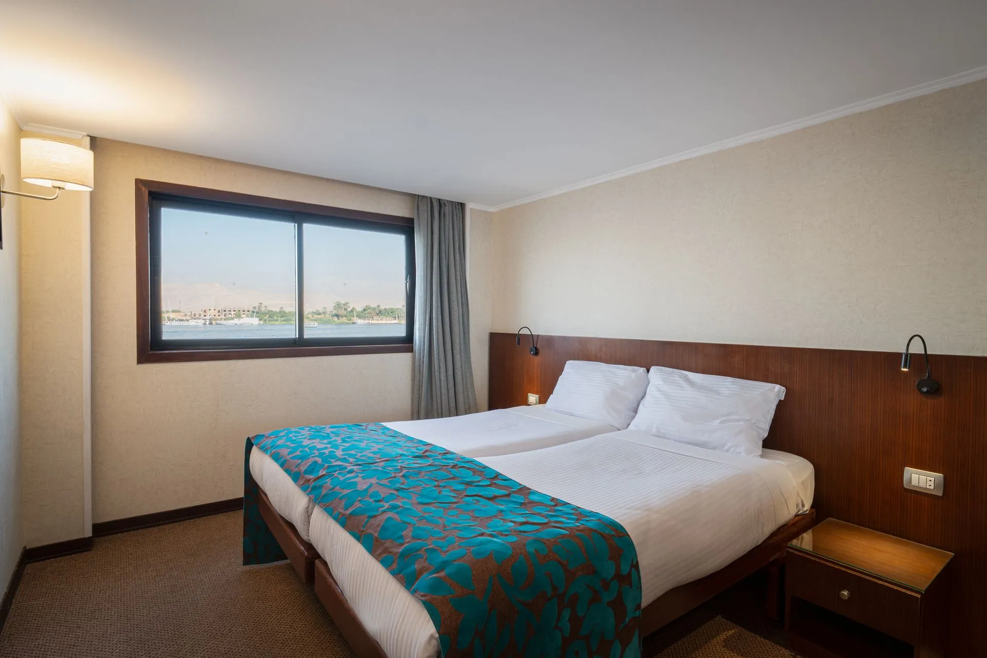 استمتع براحة لا مثيل لها على متن سفينة أوديسي النيلية. كل كابينة مجهزة بوسائل راحة عصرية، مما يضمن لك رحلة سلسة لا تُنسى. سواء اخترت غرفنا القياسية أو أجنحة جونيور الفسيحة، ستستمتع بتلفزيون مع قنوات فضائية، وميني بار، وقناة موسيقية، وخزنة، وغيرها الكثير. أبحر في النيل مع مزيج مثالي من الأصالة والراحة العصرية.