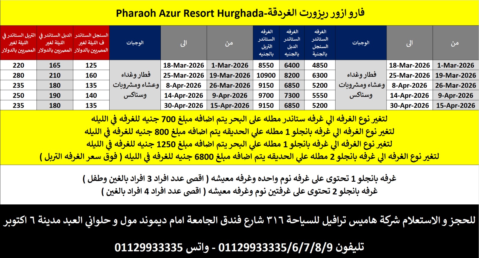 يوفر هذا المنتجع المصنف 5 نجوم شاطئ رملي خاص في الغردقة مع فرص ممتازة لممارسة غوص السكوبا، ويشتمل أيضاً على مسبح داخلي وخارجي ومركز للياقة البدنية، كما تتوفر مواقف خاصة للسيارات مجاناً، بالإضافة إلى خدمة الواي فاي في جميع المناطق ومجاناً في اللوبي فقط. يُحاط Pharaoh Azur Resort بالأراضي الخضراء، ويوفر وحدات مكيفة الهواء تشمل أفنية أو شرفات خاصة، كما تتميز كل وحدة بإطلالات على البحر أو الحدائق، وتضم تلفزيون بشاشة مسطحة مع قنوات فضائية وميني بار. تتوفر 3 أماكن لتناول الطعام تقدم المأكولات العالمية والآسيوية والشرقية والإيطالية، كما يتوفر أيضاً بار يقدم الكوكتيلات والوجبات الخفيفة. يتوفر نادي صحي مجهز بالكامل يشمل ساونا وغرفة بخار وحوض استحمام ساخن وغرفة للياقة البدنية وعلاجات المساج (يتم تطبيق تكلفة إضافية على الساونا وغرفة البخار وجلسات المساج). يقع Pharaoh Azur Resort على بعد 15 دقيقة فقط بالسيارة من مطار الغردقة و20 دقيقة بالسيارة من وسط مدينة الغردقة.