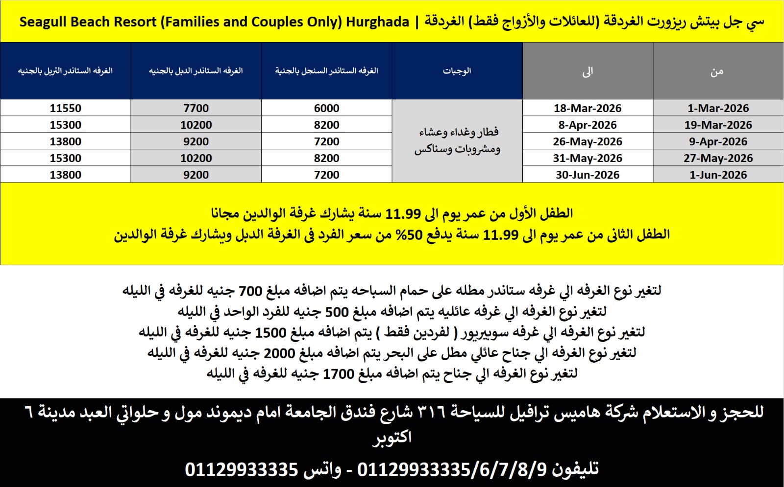 الطفل الاول من 0 حتى 11.99 سنه مجانا , يشارك غرفه الوالدين.