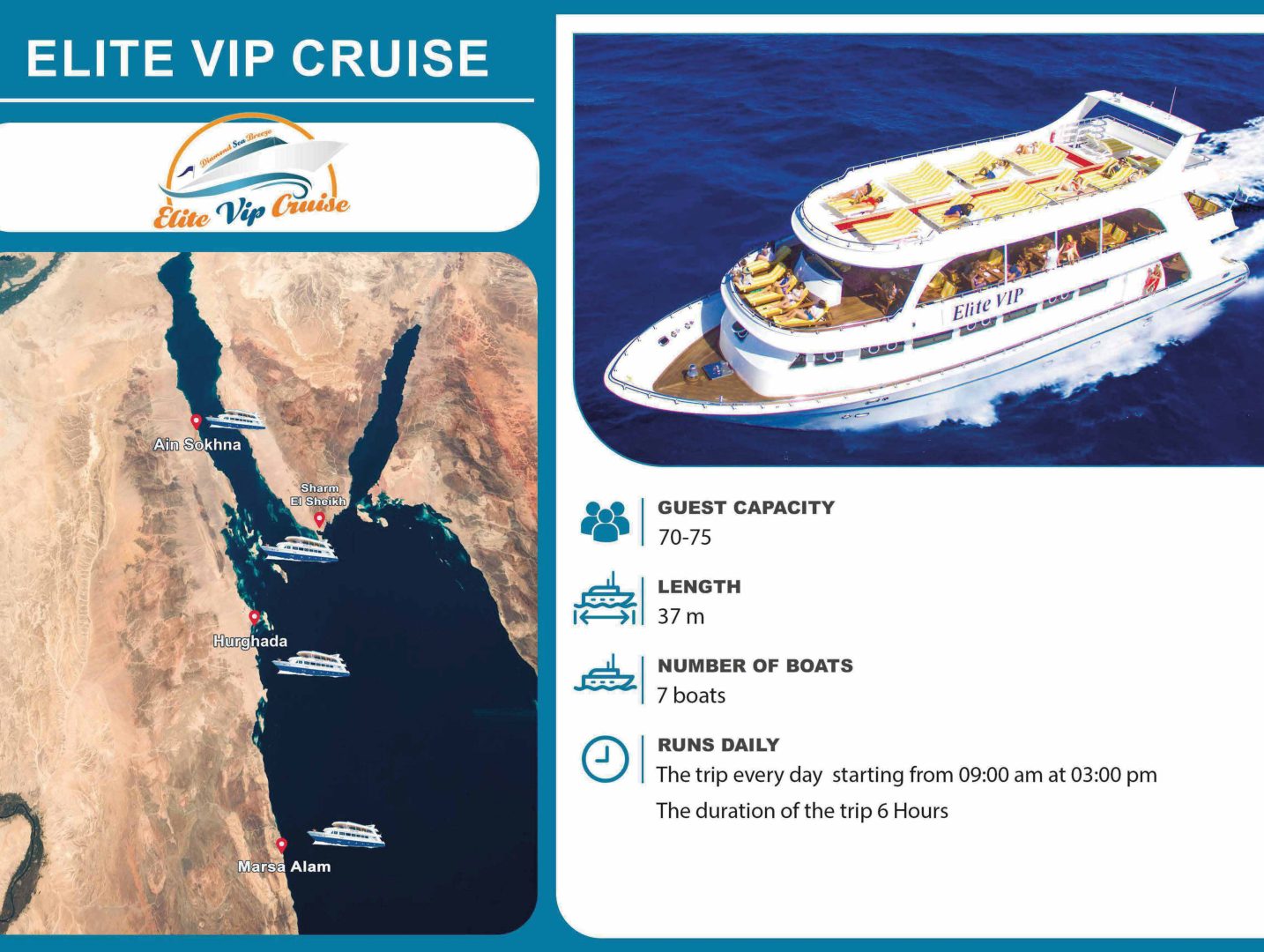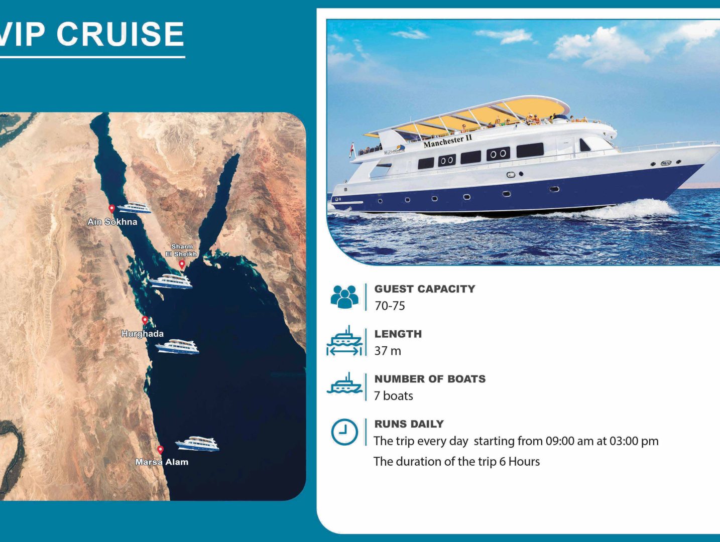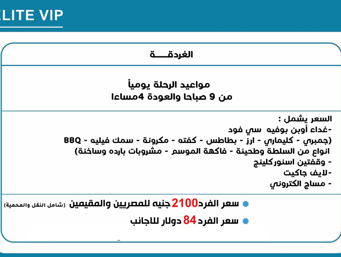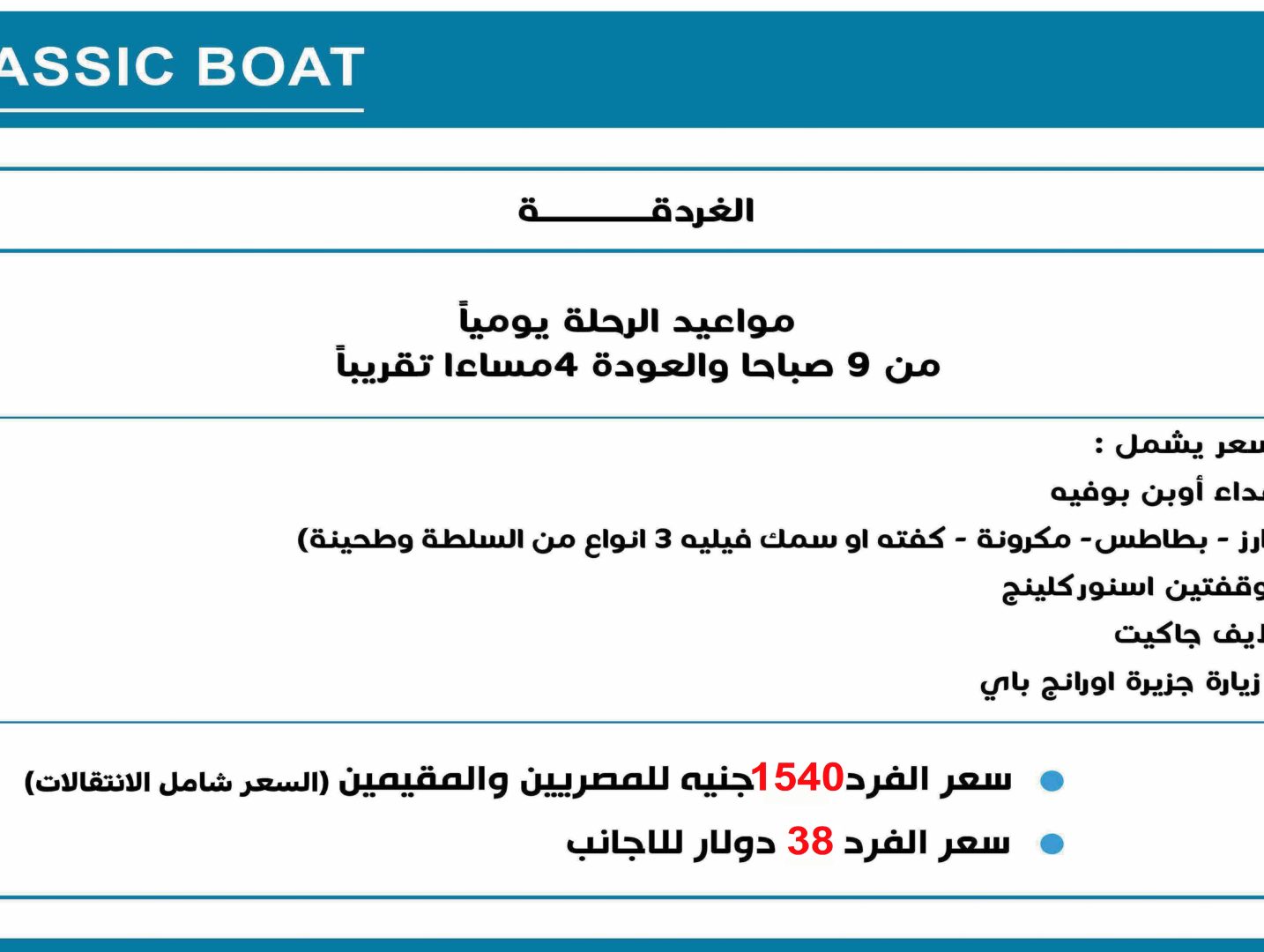 مواعيد الرحلة يومياً من 9 صباحا والعودة 4مساءا تقريباً السعر يشمل : -غداء أوبن بوفيه (ارز – بطاطس – مكرونة – كفته او سمك فيليه 3 انواع من السلطة وطحينة) – وقفتين اسنور كلينج -لايف جاكيت – زيارة جزيرة اورانج باي سعر الفرد 1540 جنيه للمصريين والمقيمين (السعر شامل الانتقالات) سعر الفرد 38 دولار للاجانب