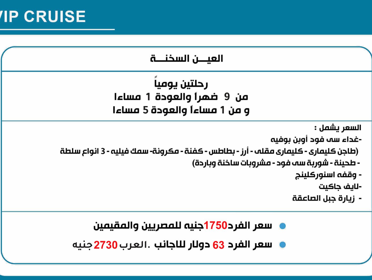 رحلتين يومياً من 9 ضهراً والعودة 1 مساءا ومن 1 مساءاً والعودة 5 مساءا السعر يشمل : -غداء سى فود أوبن بوفيه (طاجن كليمارى – كليمارى مقلى – أرز – بطاطس – كفنة- مكرونة-سمك فيليه – 3 انواع سلطة – طحينة – شوربة سى فود – مشروبات ساخنة وباردة) – وقفه اسنوركلينج -لايف جاكيت – … Continue reading “في اي بي كروز”