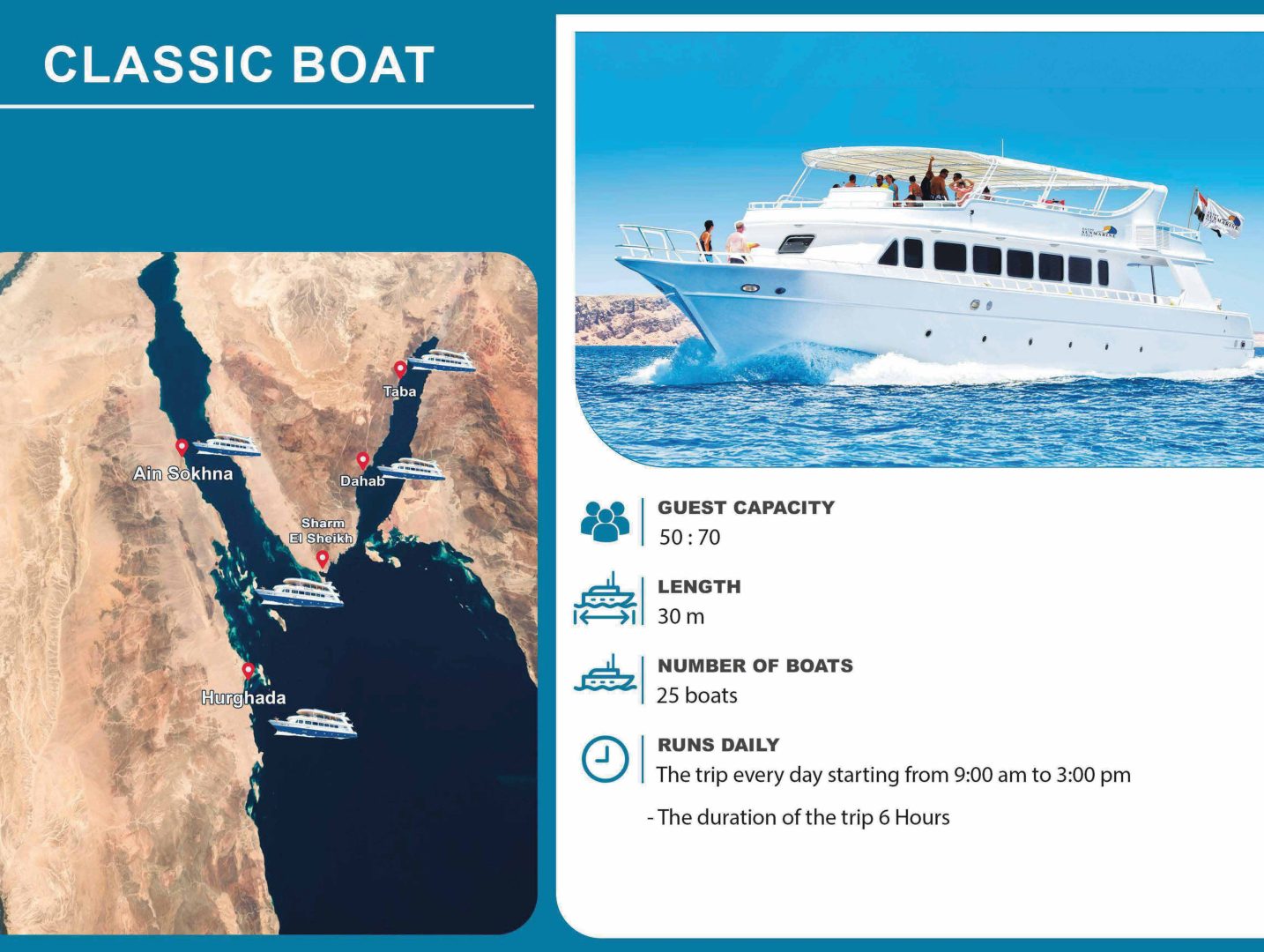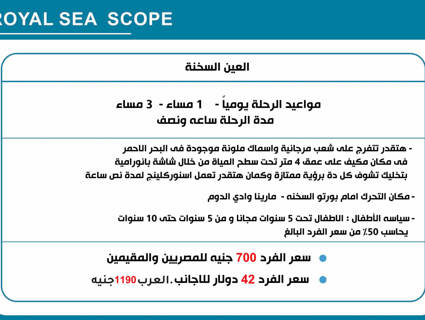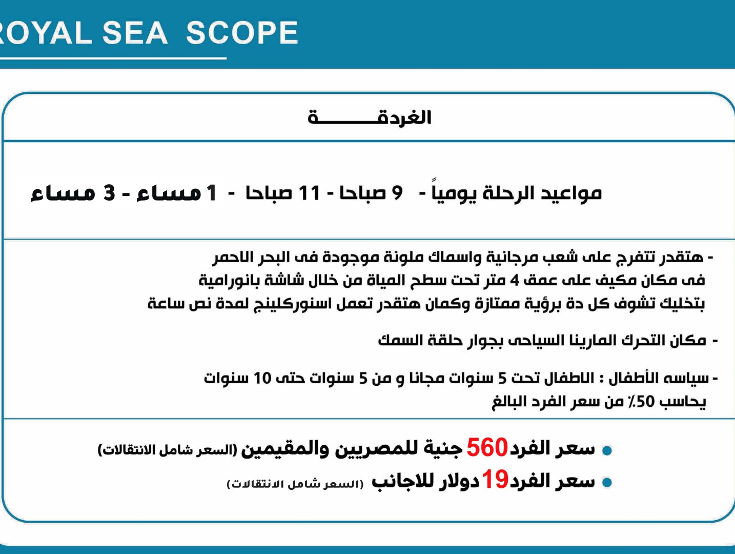 مواعيد الرحلة يومياً – 9 صباحا – 11 صباحا – 1 مساء – 3 مساء – هتقدر تتفرج على شعب مرجانية واسماك ملونة موجودة فى البحر الاحمر فى مكان مكيف على عمق 4 متر تحت سطح المياة من خلال شاشة بانورامية بتخليك تشوف كل دة برؤية ممتازة وكمان هتقدر تعمل اسنوركلينج لمدة نص ساعة – … Continue reading “رحلة رويال سي سكوب”