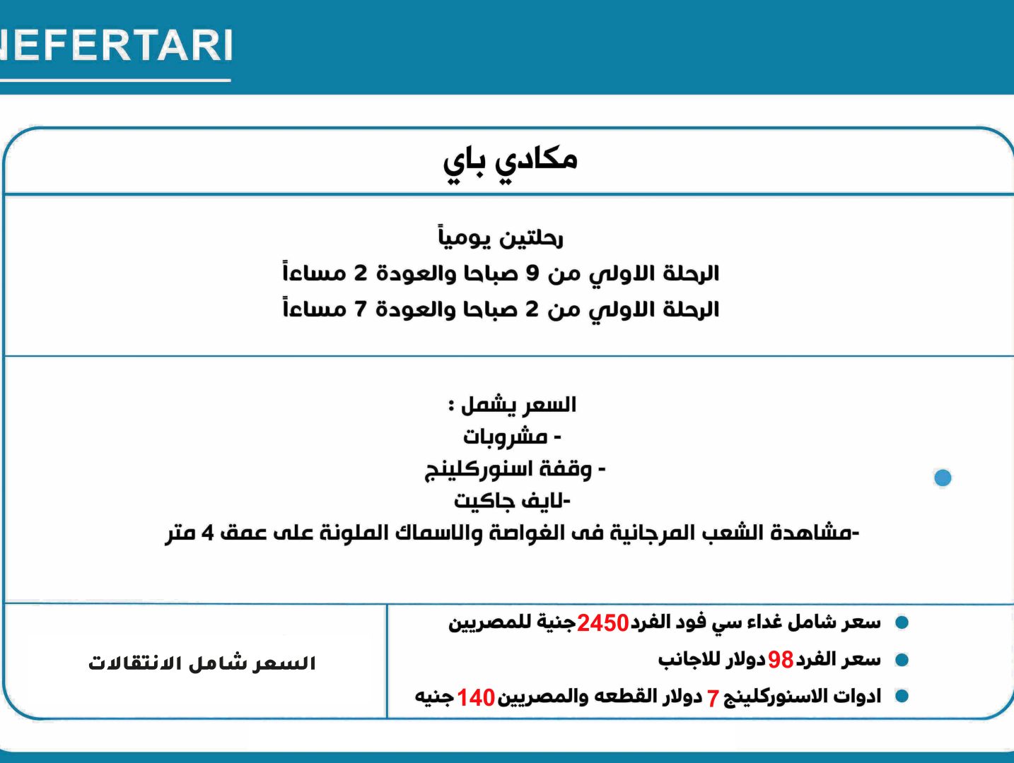 رحلتين يومياً الرحلة الاولي من 9 صباحا والعودة 2 مساءاً الرحلة الاولي من 2 صباحا والعودة 7 مساءاً السعر يشمل : – مشروبات – وقفة اسنوركلينج -لايف جاكيت -مشاهدة الشعب المرجانية فى الغواصة والاسماك الملونة على عمق 4 متر سعر شامل غداء سي فود الفرد 2450 جنية للمصريين سعر الفرد 98 دولار للاجانب السعر شامل … Continue reading “نفرتاري كروز”