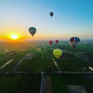 رحلات البالون أو المنطاد في الأقصر هي تجربة سياحية شهيرة تمنحك إطلالة بانورامية خلابة على المعالم الأثرية والنيل. تبدأ الرحلات عادة قبل شروق الشمس وتستمر حوالي 45 دقيقة، ويمكن أن تشمل مشاهدة وادي الملوك ومعبد حتشبسوت وتمثالي ممنون والزراعات المحيطة. يتراوح سعر الرحلة حسب توقيتها وموسمها.