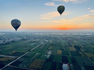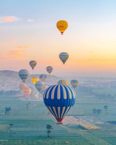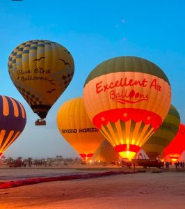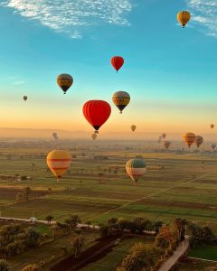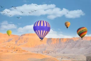رحلات البالون أو المنطاد في الأقصر هي تجربة سياحية شهيرة تمنحك إطلالة بانورامية خلابة على المعالم الأثرية والنيل. تبدأ الرحلات عادة قبل شروق الشمس وتستمر حوالي 45 دقيقة، ويمكن أن تشمل مشاهدة وادي الملوك ومعبد حتشبسوت وتمثالي ممنون والزراعات المحيطة. يتراوح سعر الرحلة حسب توقيتها وموسمها.